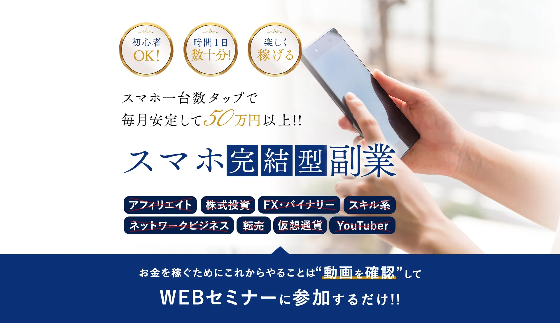 - webセミナーでは、動画でご紹介しているスマホ完結型副業の詳細や取り組み方に関しての説明になりますのでご安心ください。